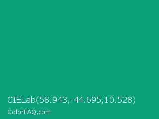 CIELab 58.943,-44.695,10.528 Color is a normal cyan color and the nearest color is Gossamer #069b81. Hex code #0ba17a and RGB value is rgb(11,161,122). In RGB color space, this color is composed of 4% red, 63% green, 48% blue, In CMYK color space, this color is composed of 93% cyan, 0% magenta, 24% yellow , 37% black , In HSL color space, this color has a hue angle of 164° , 87% saturation and 34% lightness.