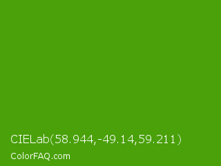 CIELab 58.944,-49.14,59.211 Color is a normal green color and the nearest color is Vida Loca #549019. Hex code #4aa10a and RGB value is rgb(74,161,10). In RGB color space, this color is composed of 29% red, 63% green, 4% blue, In CMYK color space, this color is composed of 54% cyan, 0% magenta, 94% yellow , 37% black , In HSL color space, this color has a hue angle of 95° , 88% saturation and 34% lightness.