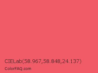 CIELab 58.967,58.848,24.137 Color is a light red color and the nearest color is Carnation #f95a61. Hex code #f15a67 and RGB value is rgb(241,90,103). In RGB color space, this color is composed of 95% red, 35% green, 40% blue, In CMYK color space, this color is composed of 0% cyan, 63% magenta, 57% yellow , 5% black , In HSL color space, this color has a hue angle of 355° , 84% saturation and 65% lightness.