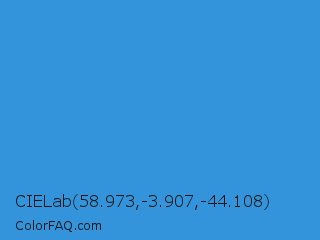 CIELab 58.973,-3.907,-44.108 Color is a normal blue color and the nearest color is Tufts Blue #3e8ede. Hex code #3394db and RGB value is rgb(51,148,219). In RGB color space, this color is composed of 20% red, 58% green, 86% blue, In CMYK color space, this color is composed of 77% cyan, 32% magenta, 0% yellow , 14% black , In HSL color space, this color has a hue angle of 205° , 70% saturation and 53% lightness.