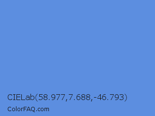 CIELab 58.977,7.688,-46.793 Color is a light blue color and the nearest color is United Nations Blue #5b92e5. Hex code #5c8ee0 and RGB value is rgb(92,142,224). In RGB color space, this color is composed of 36% red, 56% green, 88% blue, In CMYK color space, this color is composed of 59% cyan, 37% magenta, 0% yellow , 12% black , In HSL color space, this color has a hue angle of 217° , 68% saturation and 62% lightness.