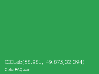 CIELab 58.981,-49.875,32.394 Color is a normal green color and the nearest color is Sea Green #2e8b57. Hex code #2da252 and RGB value is rgb(45,162,82). In RGB color space, this color is composed of 18% red, 64% green, 32% blue, In CMYK color space, this color is composed of 72% cyan, 0% magenta, 49% yellow , 36% black , In HSL color space, this color has a hue angle of 139° , 57% saturation and 41% lightness.