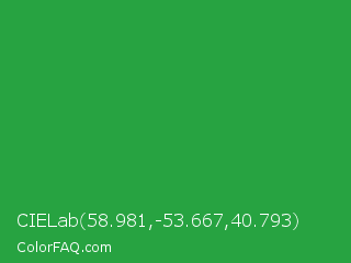 CIELab 58.981,-53.667,40.793 Color is a normal green color and the nearest color is Wageningen Green #34b233. Hex code #27a341 and RGB value is rgb(39,163,65). In RGB color space, this color is composed of 15% red, 64% green, 25% blue, In CMYK color space, this color is composed of 76% cyan, 0% magenta, 60% yellow , 36% black , In HSL color space, this color has a hue angle of 133° , 61% saturation and 40% lightness.