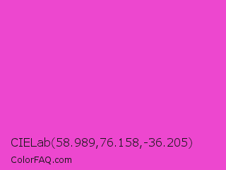 CIELab 58.989,76.158,-36.205 Color is a normal magenta color and the nearest color is Purple Pizzazz #fe4eda. Hex code #ed47cf and RGB value is rgb(237,71,207). In RGB color space, this color is composed of 93% red, 28% green, 81% blue, In CMYK color space, this color is composed of 0% cyan, 70% magenta, 13% yellow , 7% black , In HSL color space, this color has a hue angle of 311° , 82% saturation and 60% lightness.
