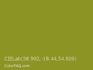 CIELab 58.992,-18.44,54.609 Color is a normal yellow color and the nearest color is Trendy Green #7c881a. Hex code #8a9523 and RGB value is rgb(138,149,35). In RGB color space, this color is composed of 54% red, 58% green, 14% blue, In CMYK color space, this color is composed of 7% cyan, 0% magenta, 77% yellow , 42% black , In HSL color space, this color has a hue angle of 66° , 62% saturation and 36% lightness.