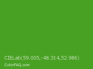 CIELab 59.005,-48.314,52.986 Color is a normal green color and the nearest color is Vida Loca #549019. Hex code #49a124 and RGB value is rgb(73,161,36). In RGB color space, this color is composed of 29% red, 63% green, 14% blue, In CMYK color space, this color is composed of 55% cyan, 0% magenta, 78% yellow , 37% black , In HSL color space, this color has a hue angle of 102° , 63% saturation and 39% lightness.