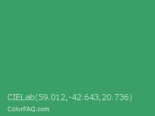 CIELab 59.012,-42.643,20.736 Color is a normal green color and the nearest color is Chateau Green #40a860. Hex code #3aa068 and RGB value is rgb(58,160,104). In RGB color space, this color is composed of 23% red, 63% green, 41% blue, In CMYK color space, this color is composed of 64% cyan, 0% magenta, 35% yellow , 37% black , In HSL color space, this color has a hue angle of 147° , 47% saturation and 43% lightness.