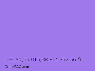 CIELab 59.015,38.861,-52.562 Color is a light indigo color and the nearest color is Medium Purple #9370db. Hex code #9f79eb and RGB value is rgb(159,121,235). In RGB color space, this color is composed of 62% red, 47% green, 92% blue, In CMYK color space, this color is composed of 32% cyan, 49% magenta, 0% yellow , 8% black , In HSL color space, this color has a hue angle of 260° , 74% saturation and 70% lightness.