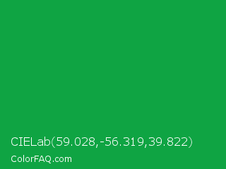 CIELab 59.028,-56.319,39.822 Color is a normal green color and the nearest color is Green Pantone #00ad43. Hex code #0fa443 and RGB value is rgb(15,164,67). In RGB color space, this color is composed of 6% red, 64% green, 26% blue, In CMYK color space, this color is composed of 91% cyan, 0% magenta, 59% yellow , 36% black , In HSL color space, this color has a hue angle of 141° , 83% saturation and 35% lightness.