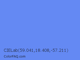 CIELab 59.041,18.408,-57.211 Color is a light blue color and the nearest color is Cornflower Blue #6495ed. Hex code #6489f3 and RGB value is rgb(100,137,243). In RGB color space, this color is composed of 39% red, 54% green, 95% blue, In CMYK color space, this color is composed of 59% cyan, 44% magenta, 0% yellow , 5% black , In HSL color space, this color has a hue angle of 224° , 86% saturation and 67% lightness.