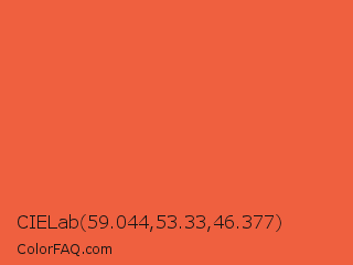 CIELab 59.044,53.33,46.377 Color is a normal red color and the nearest color is Orange Soda #fa5b3d. Hex code #ef603f and RGB value is rgb(239,96,63). In RGB color space, this color is composed of 94% red, 38% green, 25% blue, In CMYK color space, this color is composed of 0% cyan, 60% magenta, 74% yellow , 6% black , In HSL color space, this color has a hue angle of 11° , 85% saturation and 59% lightness.
