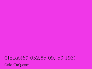 CIELab 59.052,85.09,-50.193 Color is a normal magenta color and the nearest color is Purple Pizzazz #fe4eda. Hex code #f037e8 and RGB value is rgb(240,55,232). In RGB color space, this color is composed of 94% red, 22% green, 91% blue, In CMYK color space, this color is composed of 0% cyan, 77% magenta, 3% yellow , 6% black , In HSL color space, this color has a hue angle of 303° , 86% saturation and 58% lightness.