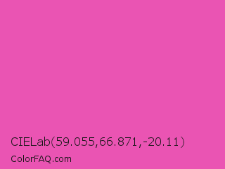 CIELab 59.055,66.871,-20.11 Color is a light magenta color and the nearest color is Brilliant Rose #f653a6. Hex code #ea54b3 and RGB value is rgb(234,84,179). In RGB color space, this color is composed of 92% red, 33% green, 70% blue, In CMYK color space, this color is composed of 0% cyan, 64% magenta, 24% yellow , 8% black , In HSL color space, this color has a hue angle of 322° , 78% saturation and 62% lightness.