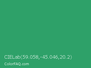 CIELab 59.058,-45.046,20.2 Color is a normal green color and the nearest color is Chateau Green #40a860. Hex code #2ea169 and RGB value is rgb(46,161,105). In RGB color space, this color is composed of 18% red, 63% green, 41% blue, In CMYK color space, this color is composed of 71% cyan, 0% magenta, 35% yellow , 37% black , In HSL color space, this color has a hue angle of 151° , 56% saturation and 41% lightness.
