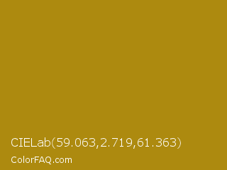 CIELab 59.063,2.719,61.363 Color is a normal yellow color and the nearest color is Dark Goldenrod #b8860b. Hex code #ad8a0f and RGB value is rgb(173,138,15). In RGB color space, this color is composed of 68% red, 54% green, 6% blue, In CMYK color space, this color is composed of 0% cyan, 20% magenta, 91% yellow , 32% black , In HSL color space, this color has a hue angle of 47° , 84% saturation and 37% lightness.