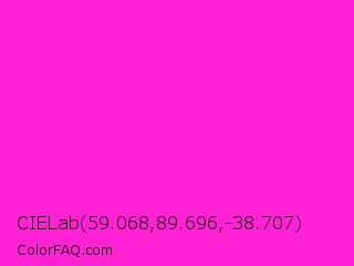 CIELab 59.068,89.696,-38.707 Color is a normal magenta color and the nearest color is Hot Magenta #ff1dce. Hex code #ff21d4 and RGB value is rgb(255,33,212). In RGB color space, this color is composed of 100% red, 13% green, 83% blue, In CMYK color space, this color is composed of 0% cyan, 87% magenta, 17% yellow , 0% black , In HSL color space, this color has a hue angle of 312° , 100% saturation and 56% lightness.