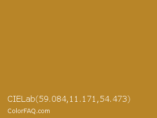 CIELab 59.084,11.171,54.473 Color is a normal orange color and the nearest color is University Of California Gold #b78727. Hex code #b88528 and RGB value is rgb(184,133,40). In RGB color space, this color is composed of 72% red, 52% green, 16% blue, In CMYK color space, this color is composed of 0% cyan, 28% magenta, 78% yellow , 28% black , In HSL color space, this color has a hue angle of 39° , 64% saturation and 44% lightness.