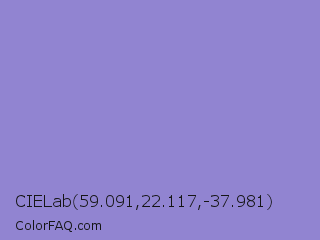 CIELab 59.091,22.117,-37.981 Color is a light indigo color and the nearest color is Chetwode Blue #8581d9. Hex code #9184d1 and RGB value is rgb(145,132,209). In RGB color space, this color is composed of 57% red, 52% green, 82% blue, In CMYK color space, this color is composed of 31% cyan, 37% magenta, 0% yellow , 18% black , In HSL color space, this color has a hue angle of 250° , 46% saturation and 67% lightness.