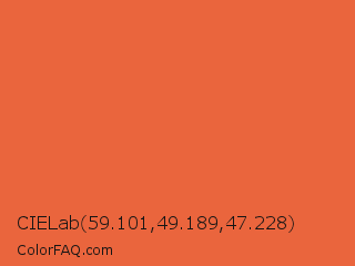 CIELab 59.101,49.189,47.228 Color is a normal red color and the nearest color is Red Damask #da6a41. Hex code #ea653d and RGB value is rgb(234,101,61). In RGB color space, this color is composed of 92% red, 40% green, 24% blue, In CMYK color space, this color is composed of 0% cyan, 57% magenta, 74% yellow , 8% black , In HSL color space, this color has a hue angle of 14° , 80% saturation and 58% lightness.