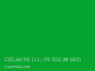 CIELab 59.111,-59.502,48.663 Color is a normal green color and the nearest color is North Texas Green #059033. Hex code #05a52f and RGB value is rgb(5,165,47). In RGB color space, this color is composed of 2% red, 65% green, 18% blue, In CMYK color space, this color is composed of 97% cyan, 0% magenta, 72% yellow , 35% black , In HSL color space, this color has a hue angle of 136° , 94% saturation and 33% lightness.