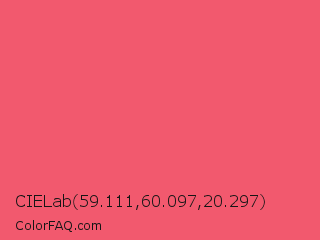 CIELab 59.111,60.097,20.297 Color is a light red color and the nearest color is Fiery Rose #ff5470. Hex code #f2596e and RGB value is rgb(242,89,110). In RGB color space, this color is composed of 95% red, 35% green, 43% blue, In CMYK color space, this color is composed of 0% cyan, 63% magenta, 55% yellow , 5% black , In HSL color space, this color has a hue angle of 352° , 85% saturation and 65% lightness.