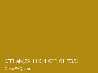 CIELab 59.116,4.622,61.735 Color is a normal yellow color and the nearest color is Dark Goldenrod #b8860b. Hex code #b0890e and RGB value is rgb(176,137,14). In RGB color space, this color is composed of 69% red, 54% green, 5% blue, In CMYK color space, this color is composed of 0% cyan, 22% magenta, 92% yellow , 31% black , In HSL color space, this color has a hue angle of 46° , 85% saturation and 37% lightness.
