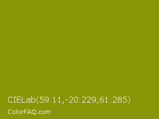 CIELab 59.11,-20.229,61.285 Color is a normal yellow color and the nearest color is Dark Yellow #9b870c. Hex code #899607 and RGB value is rgb(137,150,7). In RGB color space, this color is composed of 54% red, 59% green, 3% blue, In CMYK color space, this color is composed of 9% cyan, 0% magenta, 95% yellow , 41% black , In HSL color space, this color has a hue angle of 65° , 91% saturation and 31% lightness.