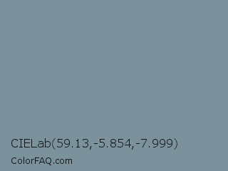 CIELab 59.13,-5.854,-7.999 Color is a normal blue color and the nearest color is Light Slate Gray #778899. Hex code #7b929c and RGB value is rgb(123,146,156). In RGB color space, this color is composed of 48% red, 57% green, 61% blue, In CMYK color space, this color is composed of 21% cyan, 6% magenta, 0% yellow , 39% black , In HSL color space, this color has a hue angle of 198° , 14% saturation and 55% lightness.