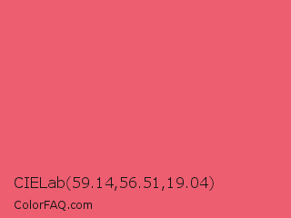 CIELab 59.14,56.51,19.04 Color is a light red color and the nearest color is Light Carmine Pink #e66771. Hex code #ed5e70 and RGB value is rgb(237,94,112). In RGB color space, this color is composed of 93% red, 37% green, 44% blue, In CMYK color space, this color is composed of 0% cyan, 60% magenta, 53% yellow , 7% black , In HSL color space, this color has a hue angle of 352° , 80% saturation and 65% lightness.