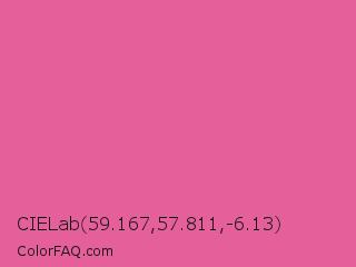 CIELab 59.167,57.811,-6.13 Color is a light rose color and the nearest color is Raspberry Pink #e25098. Hex code #e55f9b and RGB value is rgb(229,95,155). In RGB color space, this color is composed of 90% red, 37% green, 61% blue, In CMYK color space, this color is composed of 0% cyan, 59% magenta, 32% yellow , 10% black , In HSL color space, this color has a hue angle of 333° , 72% saturation and 64% lightness.