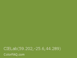CIELab 59.202,-25.6,44.289 Color is a normal green color and the nearest color is Palm Leaf #6f9940. Hex code #7a993c and RGB value is rgb(122,153,60). In RGB color space, this color is composed of 48% red, 60% green, 24% blue, In CMYK color space, this color is composed of 20% cyan, 0% magenta, 61% yellow , 40% black , In HSL color space, this color has a hue angle of 80° , 44% saturation and 42% lightness.