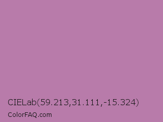 CIELab 59.213,31.111,-15.324 Color is a normal magenta color and the nearest color is Opera Mauve #b784a7. Hex code #b87baa and RGB value is rgb(184,123,170). In RGB color space, this color is composed of 72% red, 48% green, 67% blue, In CMYK color space, this color is composed of 0% cyan, 33% magenta, 8% yellow , 28% black , In HSL color space, this color has a hue angle of 314° , 30% saturation and 60% lightness.