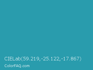 CIELab 59.219,-25.122,-17.867 Color is a normal cyan color and the nearest color is Eastern Blue #1e9ab0. Hex code #299cad and RGB value is rgb(41,156,173). In RGB color space, this color is composed of 16% red, 61% green, 68% blue, In CMYK color space, this color is composed of 76% cyan, 10% magenta, 0% yellow , 32% black , In HSL color space, this color has a hue angle of 188° , 62% saturation and 42% lightness.