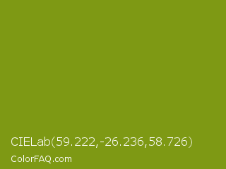 CIELab 59.222,-26.236,58.726 Color is a normal lime color and the nearest color is Trendy Green #7c881a. Hex code #7e9914 and RGB value is rgb(126,153,20). In RGB color space, this color is composed of 49% red, 60% green, 8% blue, In CMYK color space, this color is composed of 18% cyan, 0% magenta, 87% yellow , 40% black , In HSL color space, this color has a hue angle of 72° , 77% saturation and 34% lightness.