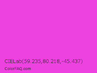 CIELab 59.235,80.218,-45.437 Color is a normal magenta color and the nearest color is Purple Pizzazz #fe4eda. Hex code #ed42e0 and RGB value is rgb(237,66,224). In RGB color space, this color is composed of 93% red, 26% green, 88% blue, In CMYK color space, this color is composed of 0% cyan, 72% magenta, 5% yellow , 7% black , In HSL color space, this color has a hue angle of 305° , 83% saturation and 59% lightness.