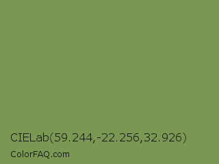CIELab 59.244,-22.256,32.926 Color is a normal green color and the nearest color is Asparagus Green #7ba05b. Hex code #7b9853 and RGB value is rgb(123,152,83). In RGB color space, this color is composed of 48% red, 60% green, 33% blue, In CMYK color space, this color is composed of 19% cyan, 0% magenta, 45% yellow , 40% black , In HSL color space, this color has a hue angle of 85° , 29% saturation and 46% lightness.