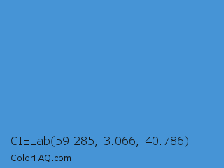 CIELab 59.285,-3.066,-40.786 Color is a normal blue color and the nearest color is Celestial Blue #4997d0. Hex code #4694d6 and RGB value is rgb(70,148,214). In RGB color space, this color is composed of 27% red, 58% green, 84% blue, In CMYK color space, this color is composed of 67% cyan, 31% magenta, 0% yellow , 16% black , In HSL color space, this color has a hue angle of 208° , 64% saturation and 56% lightness.