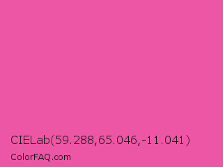 CIELab 59.288,65.046,-11.041 Color is a light rose color and the nearest color is Brilliant Rose #f653a6. Hex code #ed56a4 and RGB value is rgb(237,86,164). In RGB color space, this color is composed of 93% red, 34% green, 64% blue, In CMYK color space, this color is composed of 0% cyan, 64% magenta, 31% yellow , 7% black , In HSL color space, this color has a hue angle of 329° , 81% saturation and 63% lightness.