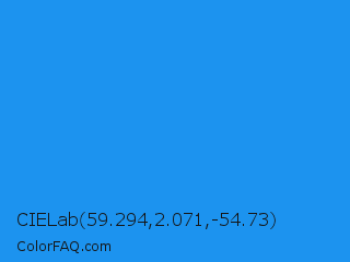 CIELab 59.294,2.071,-54.73 Color is a normal blue color and the nearest color is Button Blue #24a0ed. Hex code #1c93ef and RGB value is rgb(28,147,239). In RGB color space, this color is composed of 11% red, 58% green, 94% blue, In CMYK color space, this color is composed of 88% cyan, 38% magenta, 0% yellow , 6% black , In HSL color space, this color has a hue angle of 206° , 87% saturation and 52% lightness.