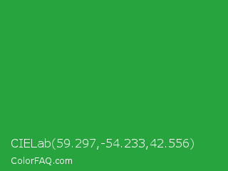 CIELab 59.297,-54.233,42.556 Color is a normal green color and the nearest color is Wageningen Green #34b233. Hex code #28a43e and RGB value is rgb(40,164,62). In RGB color space, this color is composed of 16% red, 64% green, 24% blue, In CMYK color space, this color is composed of 76% cyan, 0% magenta, 62% yellow , 36% black , In HSL color space, this color has a hue angle of 131° , 61% saturation and 40% lightness.