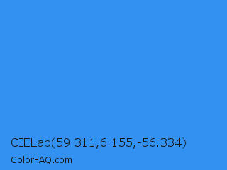 CIELab 59.311,6.155,-56.334 Color is a normal blue color and the nearest color is Bleu De France #318ce7. Hex code #3391f2 and RGB value is rgb(51,145,242). In RGB color space, this color is composed of 20% red, 57% green, 95% blue, In CMYK color space, this color is composed of 79% cyan, 40% magenta, 0% yellow , 5% black , In HSL color space, this color has a hue angle of 210° , 88% saturation and 57% lightness.