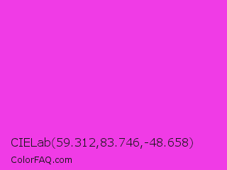CIELab 59.312,83.746,-48.658 Color is a normal magenta color and the nearest color is Purple Pizzazz #fe4eda. Hex code #f03be6 and RGB value is rgb(240,59,230). In RGB color space, this color is composed of 94% red, 23% green, 90% blue, In CMYK color space, this color is composed of 0% cyan, 75% magenta, 4% yellow , 6% black , In HSL color space, this color has a hue angle of 303° , 86% saturation and 59% lightness.