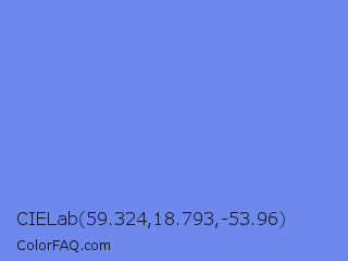 CIELab 59.324,18.793,-53.96 Color is a light blue color and the nearest color is Cornflower Blue #6495ed. Hex code #6e89ee and RGB value is rgb(110,137,238). In RGB color space, this color is composed of 43% red, 54% green, 93% blue, In CMYK color space, this color is composed of 54% cyan, 42% magenta, 0% yellow , 7% black , In HSL color space, this color has a hue angle of 227° , 79% saturation and 68% lightness.