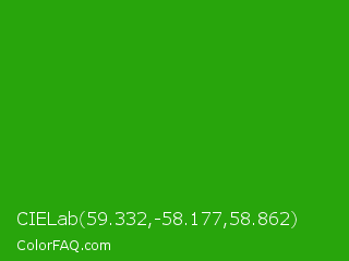 CIELab 59.332,-58.177,58.862 Color is a normal green color and the nearest color is Slimy Green #299617. Hex code #28a50c and RGB value is rgb(40,165,12). In RGB color space, this color is composed of 16% red, 65% green, 5% blue, In CMYK color space, this color is composed of 76% cyan, 0% magenta, 93% yellow , 35% black , In HSL color space, this color has a hue angle of 109° , 86% saturation and 35% lightness.