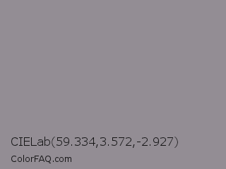 CIELab 59.334,3.572,-2.927 Color is a normal purple color and the nearest color is Mountain Mist #959396. Hex code #938d94 and RGB value is rgb(147,141,148). In RGB color space, this color is composed of 58% red, 55% green, 58% blue, In CMYK color space, this color is composed of 1% cyan, 5% magenta, 0% yellow , 42% black , In HSL color space, this color has a hue angle of 291° , 3% saturation and 57% lightness.