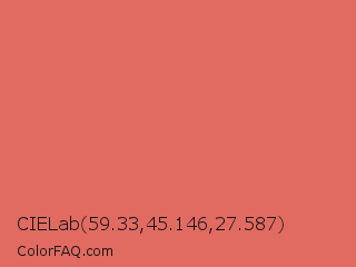 CIELab 59.33,45.146,27.587 Color is a light red color and the nearest color is Sunglo #e16865. Hex code #e16b61 and RGB value is rgb(225,107,97). In RGB color space, this color is composed of 88% red, 42% green, 38% blue, In CMYK color space, this color is composed of 0% cyan, 52% magenta, 57% yellow , 12% black , In HSL color space, this color has a hue angle of 5° , 68% saturation and 63% lightness.