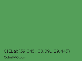 CIELab 59.345,-38.391,29.445 Color is a normal green color and the nearest color is Fruit Salad #4f9d5d. Hex code #549f59 and RGB value is rgb(84,159,89). In RGB color space, this color is composed of 33% red, 62% green, 35% blue, In CMYK color space, this color is composed of 47% cyan, 0% magenta, 44% yellow , 38% black , In HSL color space, this color has a hue angle of 124° , 31% saturation and 48% lightness.