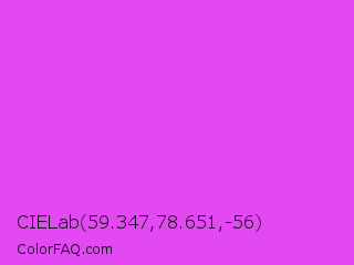CIELab 59.347,78.651,-56 Color is a light magenta color and the nearest color is Purple Pizzazz #fe4eda. Hex code #e249f3 and RGB value is rgb(226,73,243). In RGB color space, this color is composed of 89% red, 29% green, 95% blue, In CMYK color space, this color is composed of 7% cyan, 70% magenta, 0% yellow , 5% black , In HSL color space, this color has a hue angle of 294° , 88% saturation and 62% lightness.