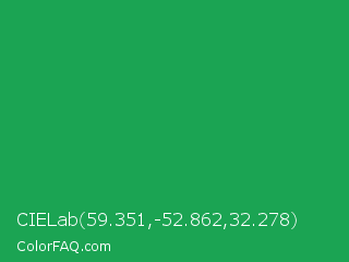 CIELab 59.351,-52.862,32.278 Color is a normal green color and the nearest color is Green Pigment #00a550. Hex code #1ba453 and RGB value is rgb(27,164,83). In RGB color space, this color is composed of 11% red, 64% green, 33% blue, In CMYK color space, this color is composed of 84% cyan, 0% magenta, 49% yellow , 36% black , In HSL color space, this color has a hue angle of 145° , 72% saturation and 37% lightness.
