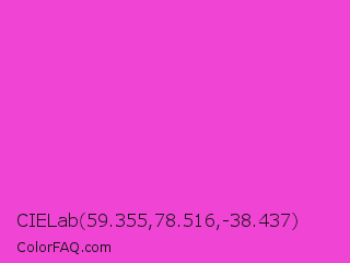 CIELab 59.355,78.516,-38.437 Color is a normal magenta color and the nearest color is Purple Pizzazz #fe4eda. Hex code #f044d4 and RGB value is rgb(240,68,212). In RGB color space, this color is composed of 94% red, 27% green, 83% blue, In CMYK color space, this color is composed of 0% cyan, 72% magenta, 12% yellow , 6% black , In HSL color space, this color has a hue angle of 310° , 85% saturation and 60% lightness.
